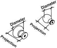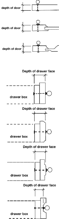 Knobs: A knob can be any shape but it is installed with a single screw. Their dimensions are noted in the illustration — diameter and projection. These can be important when looking at the clearances of doors and drawers.